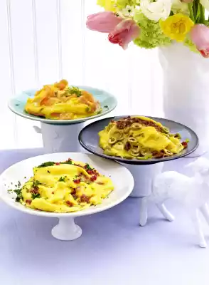 Drain the tomatoes and cut into strips. Cut olives into slices. Whisk 4 eggs and 6 tablespoons of milk, season with salt and pepper. Heat 1 tablespoon of oil in a frying pan. Add the eggs, tomatoes and olives to the pan and allow to set. Sprinkle bacon scrambled eggs with herbs, garnish salmon scrambled eggs with dill. Arrange scrambled eggs on plates
