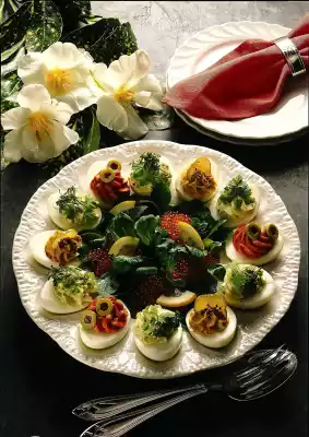 Inject fillings into the hollowed eggs. Garnish with cucumber slices and coarse pepper, halved olives, cress and chervil leaves. Serve garnished with trout caviar on lamb's lettuce and lemon wedges.