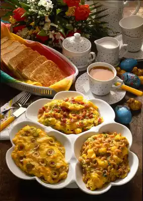 For the ham-chives scrambled eggs cut the ham into small cubes. Wash the chives and cut into fine rolls. Whisk 3 eggs and season with salt and pepper. Heat 20 g fat in a pan and add the eggs.