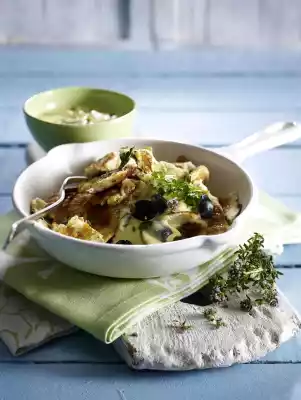 Mix yoghurt and salad cream. Peel the garlic and press it directly into it. Cut olives into slices and fold in. Season cream with mustard, salt and pepper.