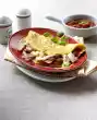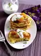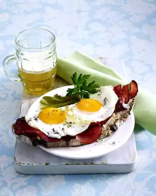 Arrange 2 eggs on each slice of bread. Garnish with cucumber fans and parsley
