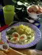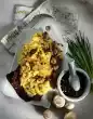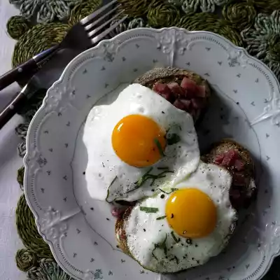 Beat 4 eggs one after the other and carefully slide them into the pan. Fry over medium heat for about 3 minutes. (Use a spatula to pull the egg whites over the yolks) Season with salt and pepper and place on the ham sandwiches.