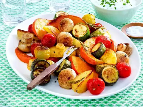 Drain the potatoes and put them in a large bowl with the pumpkin slices, zucchini and rosemary. Season with salt and pepper, pour 2 tablespoons of olive oil over it and mix everything well. Spread 1 teaspoon of oil on a fat pan of the oven (33 x 39 cm). Spread the vegetables on top and bake in the preheated oven (electric cooker: 200 °C/ convection oven: 175 °C/ gas: see manufacturer) for approx. 45 minutes