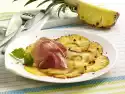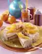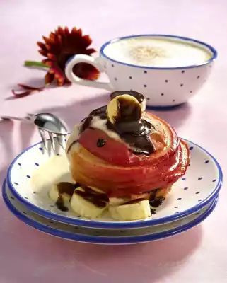 Bake in the preheated oven (electric cooker: 200 °C/ convection oven: 175 °C/ gas: level 3) for about 12 minutes. In the meantime peel and slice the bananas. Finely mash 100 g banana pieces, crème fraiche and 1 tablespoon lemon juice. Arrange apples on plates with some banana cream and remaining banana slices. Serve sprinkled with chocolate sauce
