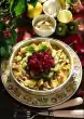 Wash the apples, cut out the core. Cut apples into fine slices and put them back together again as an apple. Place in an ovenproof dish. Sprinkle with 4 tablespoons of lemon juice and rum. Spread butter in flakes on top.