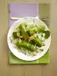 Whisk milk and egg yolk, stir in pear brandy and pour over the onions. Cover casserole with butter flakes and cover with aluminium foil. Bake in the preheated oven (electric cooker: 200 °C/ convection oven: 175 °C/ gas: level 3) for about 15 minutes. Remove aluminium foil and brown the casserole for another 10 minutes. Dust the casserole with icing sugar and decorate with pear halves and lemon balm. Casserole tastes hot or cold