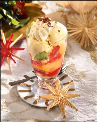 Mix prepared fruit with vanilla sugar and liqueur or pineapple juice. Divide into 4 dessert glasses and let them steep a little