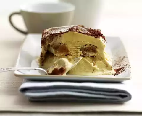 Mix 1 teaspoon of coffee powder, sugar and 3 tablespoons of hot water. Add the liqueur. Stir ice and 3 teaspoons of coffee powder with the whisk of the hand mixer until creamy. Put half of the ice cream in an ovenproof dish (approx. 1500 ml content) and smooth it down. Spread the biscuits on the ice cream, pressing them lightly into the ice cream and sprinkle with coffee-liqueur mixture. Put the remaining ice cream on the biscuits, smooth it down and put them in the freezer immediately for 3-4 hours. Dust with cocoa before serving