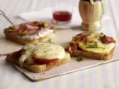 Cover two slices with tomatoes and mozzarella. Cover 2 slices with fried egg and bacon and sprinkle with cheese. Spread the uncoated slices with cream cheese, cover with ham and olives.