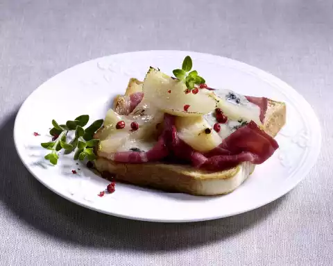 Pluck the gorgonzola into pieces and sprinkle on top. Place the toast on a baking tray lined with baking paper. Bake in a preheated oven (electric cooker: 200 °C/ convection oven: 175 °C/ gas: level 3) for 5-8 minutes until the cheese has melted.