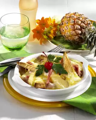 Add toast, ham and pineapple. Add cheese crème fraîche in patches and sprinkle with remaining cheese. Bake in a preheated oven (electric cooker: 200 °C/ convection oven: 175 °C/ gas: level 3) for approx. 15 minutes.
