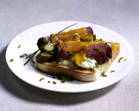 Drain the gherkins and cut into slices. Toast bread in the toaster until golden brown. Spread with remoulade. Roll up the roast beef and place on the toast. Spread cucumbers on top, sprinkle with cheese.