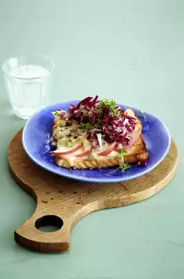 Toast slices of toast in a toaster and brush with butter. Wash the apple, quarter it and remove the core. Cut quarter into slices. Spread the slices on the toasts, crumble the cheese over them.