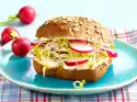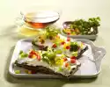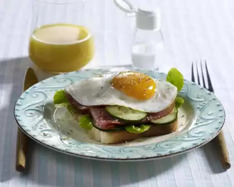 Cover with lettuce, cucumber and ham. Place eggs on top and season with salt and pepper. Arrange on plates.