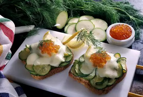 Deglaze with broth. Cook for about 5 minutes and season with salt and pepper. Spread the zucchini on the toast slices and cover each with a slice of cheese, then cover and let the cheese melt. Spread the caviar on the toast slices and garnish the bread with lemon wedges and dill