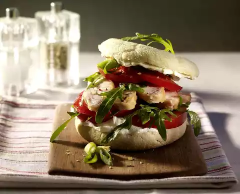 Clean, wash and drain the rocket. Clean and wash spring onion and cut into fine rings. Take out chicken filet and cut into slices. Unfold toast rolls and toast.