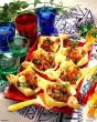 Spread the toast with cream cheese. Place tomatoes, rocket, chicken filet and spring onion on top. Sprinkle with coloured pepper.