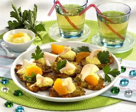 Heat oil in 2 portions in a coated pan. Pour the dough into the pan in portions and fry until golden brown while turning. Drain on kitchen paper. Quarter the cold cuts. Garnish each thaler with 1 blob of curd cheese cream, cold cuts, mandarins and parsley set aside.