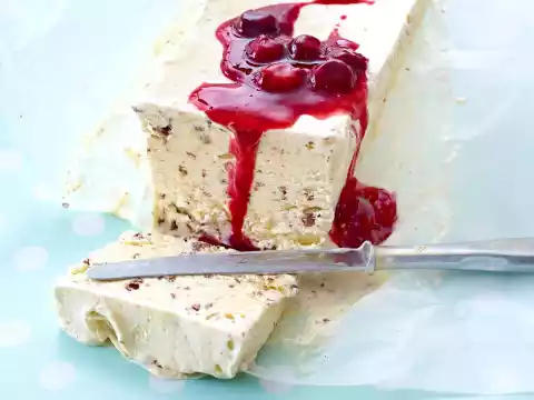 Remove the parfait from the freezer and let it stand at room temperature for about 15 minutes. Bring drained cherry juice and 5 tbsp. sugar to the boil. Mix the starch with a little water and thicken the simmering stock. Add the cherries, bring to the boil again briefly, remove from the heat, allow to cool slightly. Cut parfait into slices, arrange with cherries