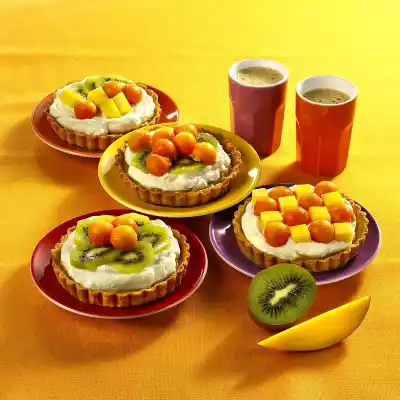 Roll out dough and cut out 8 circles (approx. 13 cm Ø). Grease the quiche cups with the lifting base (10.5 cm Ø) and dust with flour. Line the quiche cups with the dough circles, press the edges of the dough slightly. Prick the base several times with a fork. Bake in the preheated oven (electric cooker: 200 °C/ convection oven: 175 °C/ gas: level 3) for 12-15 minutes. Let the tartlets cool down. Then remove the tartlets from the tartlets. Meanwhile, peel the mangos, cut the flesh from the stone and dice them. Peel and slice the kiwis. Halve the papayas, scrape out the seeds with a spoon and cut out balls from the flesh. Whip the cream until stiff and allow vanilla sugar to trickle in. Spread the bottom of the quiches with the condensed milk cream.