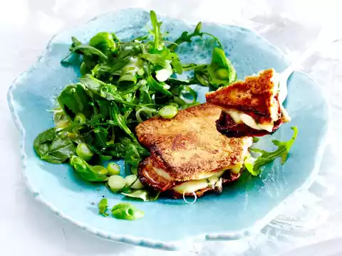 For the vinaigrette, mix vinegar, honey, some salt and pepper. Fold in 3 tablespoons of tomato oil. Mix the rest of the rocket, spring onions, basil and vinaigrette. Arrange tofu slices and salad.