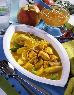 Peel and quarter the apple and remove the core. Cut the apple quarters into slices and add them about 5 minutes before the end of the cooking time. Mix starch and yoghurt, stir in chutney. Bring to the boil and season to taste with salt and lemon juice. Put the tofu curry in a bowl and serve. Basmati rice tastes good with it