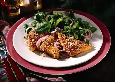 Carefully mix lamb's lettuce, onion rings and sprouts with the marinade. Arrange tofu slices and salad on plates.