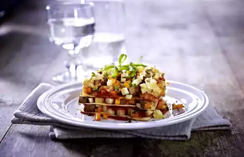 Wash tarragon, shake dry and chop except for something to garnish. Fold the tofu into the vegetable mixture. Grease an ovenproof dish (approx. 20 x 20 cm). Layer the vegetable mixture alternately with the lasagne dishes, starting with 2 adjacent lasagne dishes and finishing with the vegetable mixture.