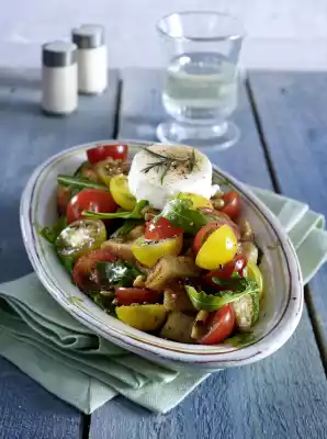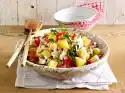 remove and let it cool down. Wash and halve the tomatoes. Wash the rocket, dab dry, clean and chop coarsely. Whisk vinegar, salt, pepper and 1 teaspoon honey. Add 5 tablespoons of oil and season to taste again.