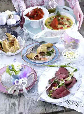Stir cream cheese, tomato paste and Ajvar until smooth. Season to taste with salt, pepper and paprika. Arrange dip and croissants.