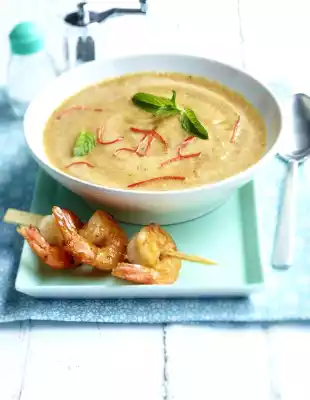 Put the vegetables, melon and vinegar in a blender and puree finely. Season to taste with salt and pepper. If the soup is too thick, dilute with a little water. Chill for about 30 minutes. Wash the chillies, grate dry, remove seeds and cut into fine strips. Peel prawns, except for the tail fin, and remove the intestines. Wash the shrimps and dab dry. Put 3 prawns on each skewer. Heat the oil in a large pan and fry the shrimp skewers in it for 3-4 minutes, turning. Take them out and season with salt and pepper. Spread the soup on plates and garnish with chilli and mint. Add the prawn skewers