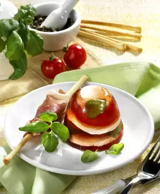 Soak gelatine in cold water. Wash the tomatoes. Cut tomatoes and mozzarella into slices. Wash basil, shake dry and remove leaves