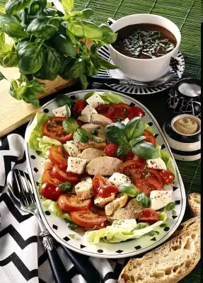 Season to taste with salt, pepper and sugar, let it cool down a bit. Clean, wash and slice the tomatoes. Wash and quarter the cherry tomatoes. Drain the mozzarella. Cut into large cubes. Wash the basil and, except for a few leaves for garnishing, cut into strips and add to the vinaigrette. Cut the chicken filet into slices. Put the lettuce leaves on a plate. Add tomato and chicken slices and mozzarella cubes. Drizzle with some vinaigrette.