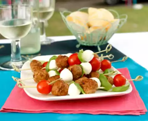 Soak toast in cold water. Peel and finely chop the onion. Squeeze the bread well. Knead with minced meat, onion, egg and tomato paste. Season with salt and pepper. Form minced meat into small balls. Heat the oil in a pan and fry the balls in two portions for 6-8 minutes while turning. Drain on kitchen paper and let cool down. Drain the mozzarella. Wash tomatoes and basil, dab dry. Put meatballs, mozzarella, tomatoes and basil leaves alternately on small skewers. Bread tastes good with them