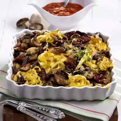 Place the pasta as nests in a greased casserole dish. Add the mushroom mixture and pour egg milk over it. Grate cheese on top. In the preheated oven (electric cooker: