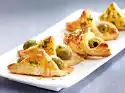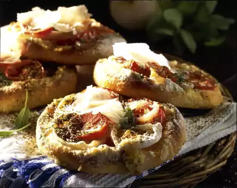 Remove the roll dough from the tin according to instructions. Press flat in portions on a floured baking tray. Sprinkle the dough with oil. Spread tomatoes and onions on top. Season everything with salt, pepper, sage and herbs from Provence
