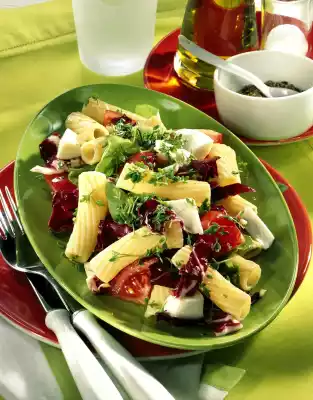 Cook the pasta in boiling salted water for about 8 minutes, then drain. In the meantime, clean, wash and slice the tomatoes. Drain mozzarella and cut into cubes. Wash lettuce leaves and pluck into bite-sized pieces.