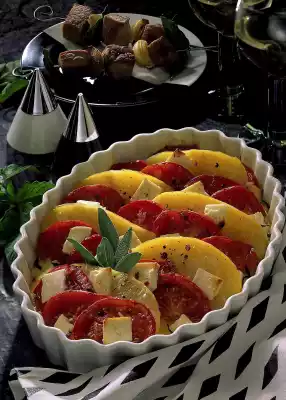 Peel and wash the potatoes and cut them in half lengthwise. Cook for about 15 minutes in boiling salted water. Wash the tomatoes, cut out the stem in a wedge shape. Cut the tomatoes into slices. Dice the feta cheese. Whisk egg yolk and cream. Season with salt and pepper. Wash sage leaves, dab dry and, except for a few for garnishing, cut into strips and add to the egg cream. Spread the gratin dish with olive oil. Drain the potatoes and place them in the gratin dish with the tomato slices. Sprinkle with sheep's cheese cubes and bake in the preheated oven (electric oven: 175 °C/ gas: level 2) for approx. 25 minutes. In the meantime, wash the meat, dab dry and cut into large cubes. Peel and slice the onion. Push the meat, onions and bay leaves onto the skewers. Heat oil in a coated pan and fry the skewers in it for about 10 minutes, turning them over. Garnish the gratin with remaining sage leaves and serve with the skewers sprinkled with coloured pepper