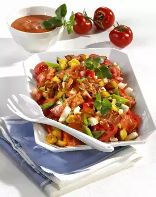 Let it cool down a little. Wash the remaining tomatoes, cut 500 g into slices and dice the rest. Peel and roughly dice the onions. Line a large plate with tomato slices. Mix potato cubes, diced tomatoes, beans and onions and arrange on the tomato slices.