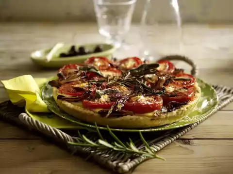 Remove the base from the oven and spread the cheese cream on top. Spread tomatoes with the cut surface facing upwards, onions, rosemary and sage leaves on top. Season with sea salt and pepper.