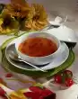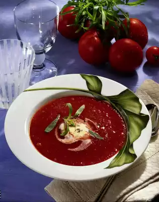 Add tomato paste and tarragon and stir in. Deglaze with the pureed tomatoes, bring to the boil and season with ketchup, salt, pepper, sugar and paprika. Serve the soup with a dash of crème fraîche sprinkled with coloured pepper on a soup plate. Garnish with the tarragon put aside