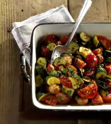 Wash and clean the zucchini and tomatoes. Quarter the tomatoes, cut the zucchini into slices. Peel onions and garlic. Chop onions coarsely, crush garlic finely. Wash herbs and chop roughly.