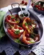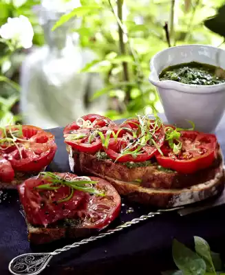 Clean, wash and cut the spring onion into long thin strips. Wash, clean and slice the tomatoes. Spread slices of bread with pesto, cover with tomatoes and sprinkle with strips of spring onion