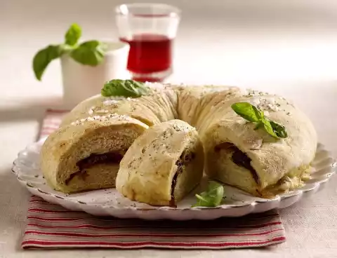 Season with a little salt and pepper and drizzle with 1 tablespoon of olive oil. Roll the dough over the filling and form into a ring. Stick the ends together. Brush the ring with 1 tablespoon of olive oil and sprinkle with some coarse sea salt and dried herbs. Place the ring on a baking tray lined with baking paper and leave to rise for another 15-20 minutes. Bake bread in a preheated oven (electric cooker: 200 °C/ convection oven: 175 °C/ gas: level 3) for 30-40 minutes. If the ring becomes too dark, cover with aluminium foil. Remove bread ring from the oven, let it cool down for about 30 minutes and serve lukewarm or cold