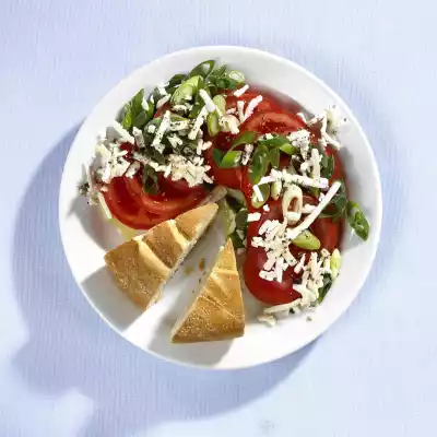 Clean, wash and drain the tomatoes and spring onions. Slice the tomatoes and cut the spring onions into fine rings. Arrange tomatoes on a plate and sprinkle with spring onions and feta cheese.