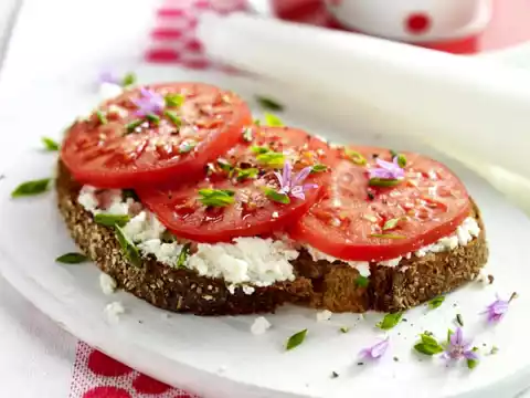 Wash the chives and cut into fine rings. Spread the slice of bread with ricotta. Place tomato slices on the bread and season with sea salt and pepper, sprinkle with chives rolls and flowers.