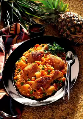 Add the onion, carrot and rice and sauté briefly. Add chunky tomatoes and stock, cover and cook over low heat for 20 minutes. Drain pineapple and cut into pieces. Add pineapple and peas five minutes before the end of cooking time.