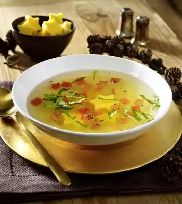 Season soup with salt and pepper. Wash basil, shake dry and cut into fine strips. Quarter the rest of the tomato and remove the seeds. Cut the flesh into fine cubes. Cut out small stars from the parmesan mass and add them to the consommé with the diced tomatoes.