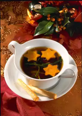 Clean and wash the carrots and cut them lengthwise into slices about 1/2 cm thick. Cut out small stars (about 2 cm long) from the slices. Bring the tomato consommé to the boil, add the carrot stars, cover and cook over a medium heat for about 10 minutes. Clean, wash and cut the leek into pieces of about 5 cm length. Cut the leek pieces into fine sticks. Add the sticks to the consommé about 5 minutes before the end of the cooking time and cook them. Season soup with salt and pepper to taste, arrange in soup bowls and serve