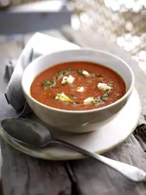 Finely puree the soup with a hand blender. Season to taste with salt, pepper and honey. Crumble the cream cheese and spread on the soup with the seasoning oil. Serve immediately. Baguette tastes good with it.